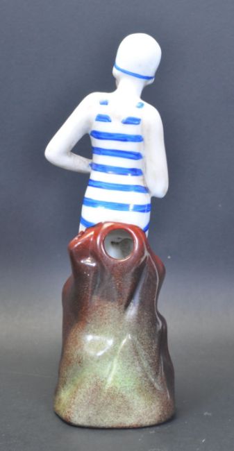 An Art Deco style ceramic figurine of a lady in a bathing suit, perched on a naturalistic base. Measures 18 cm tall.