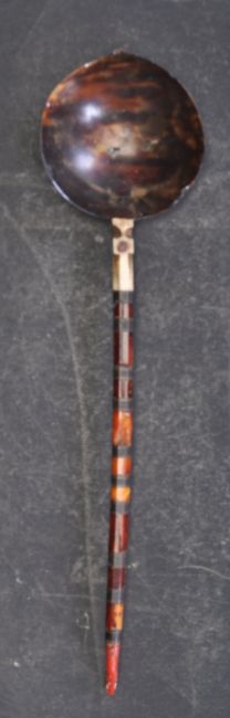 A 19th century Turkish Sherbert spoon having inlaid handle with amber, coral, with bone / marine ivory stem and tortoiseshell bowl.