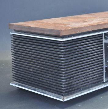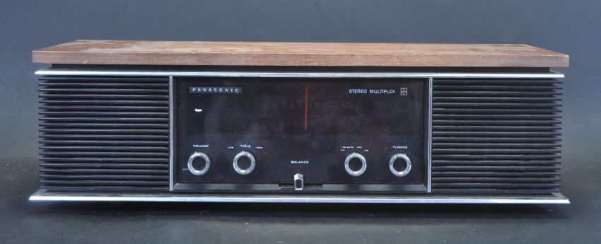 A vintage retro mid 20th century Panasonic Model RE 7300 Stereo Multiplex radio tuner receiver having teak wood top with, front speakers and smoked plexiglass front with chrome control knobs. Measures 53 cm long.