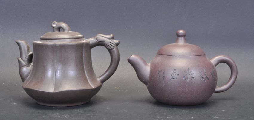 Two vintage 20th century Chinese Yi Xing matt brown ceramic teapots. One teapot having Chinese characters to the side and the other marked with a stamp underneath.