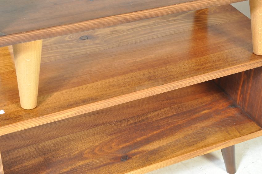 A collection of four modern minimalist low media units all having dark hard wood shelves raised on angular tapering legs. Measures: 45cm x 80cm x 40cm.