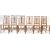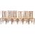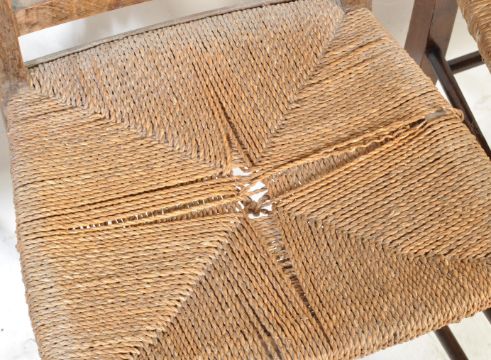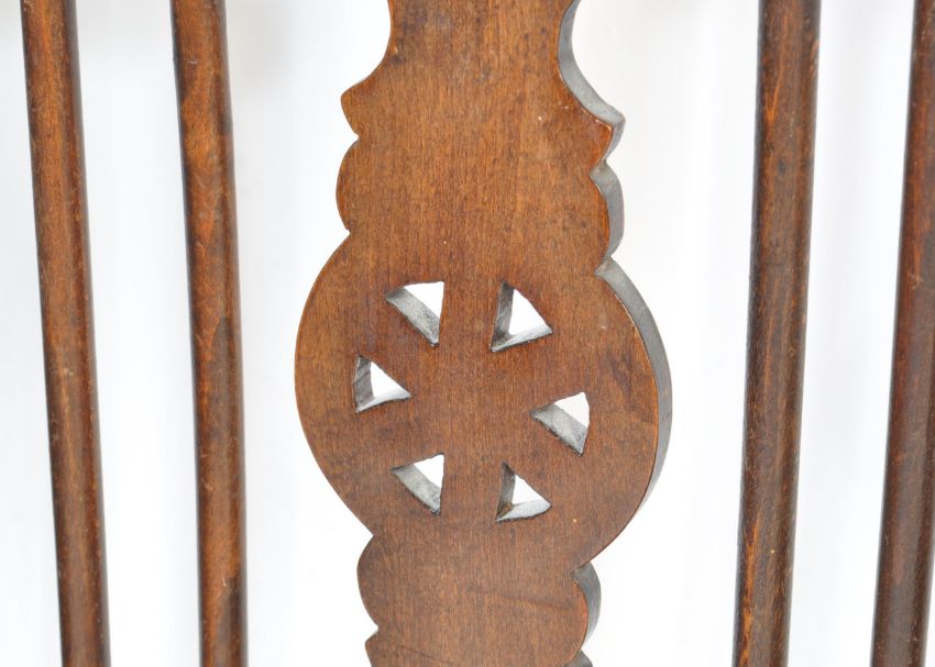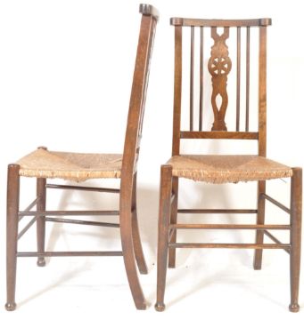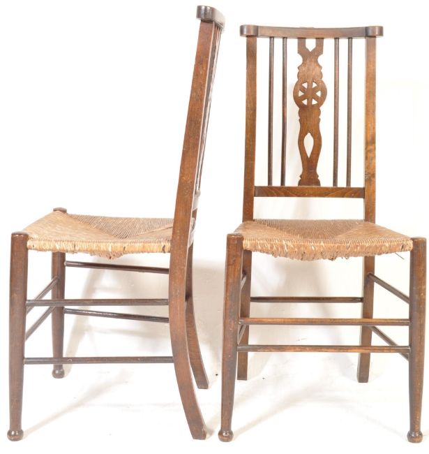 A set of six late Victorian 19th century Arts and Crafts beech wood carved wheelback dining chairs. The chairs having rush seats being raised on turned upright legs united by twin stretchers.  Railed uprights with carved wheel to centres. Measures: 93cm x 44cm x 38cm.