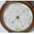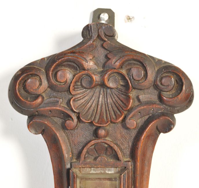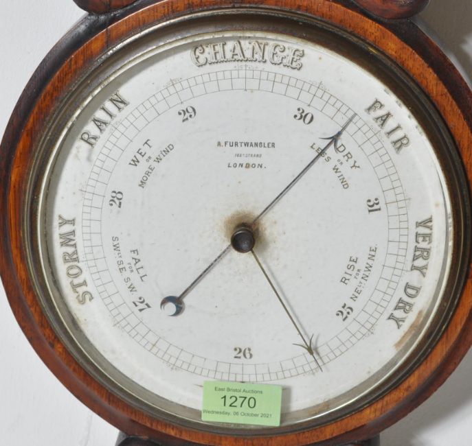 A 19th Century Victorian oak framed aneroid banjo barometer having floral carving to the top above a thermometer and a white enamel dial to the base. Markers mark - A Furtwangler Strand to the clock face. Measures 85cm high.