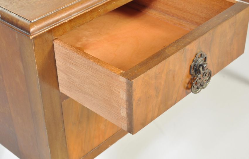 An early 20th century circa 1920’s Queen Anne dressing table. The dressing table having tripped mirror atop over shaped top with single drawer to the frieze flanked by two bank of drawers raised on shaped legs. Bath cabinet label to the back.