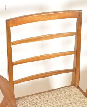 A. H. McIntosh & Co. of Kirkcaldy - Model 9074 - A matching set of eight retro vintage mid 20th Century teak framed dining / side chairs. The chairs including two carver armchairs and six dinners with each having ladder backrests with baggie upholstered seat pads with each being raised on splayed tapering supports. Labels present. Measures: 83cm 57cm x 44cm.