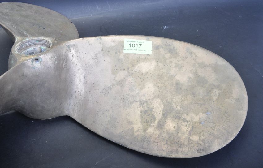 A vintage retro mid 20th century solid bronze boat / ship's propeller having Tri-bladed, with central hub. Measures 11 cm x 49 cm diameter.