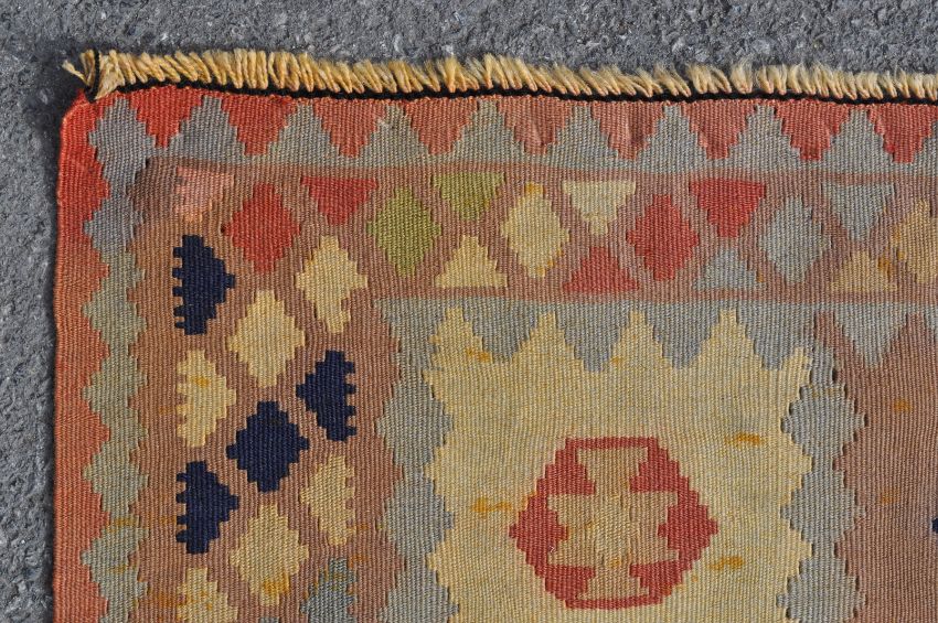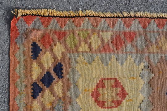 A 20th century hand woven Persian Islamic Qashgai Kilim carpet rug / runner. The carpet having blue, red, pink green, cream colour geometrical medallion to the centre with geometrical multicolour decorated main border. Measures: 270cm x 80cm