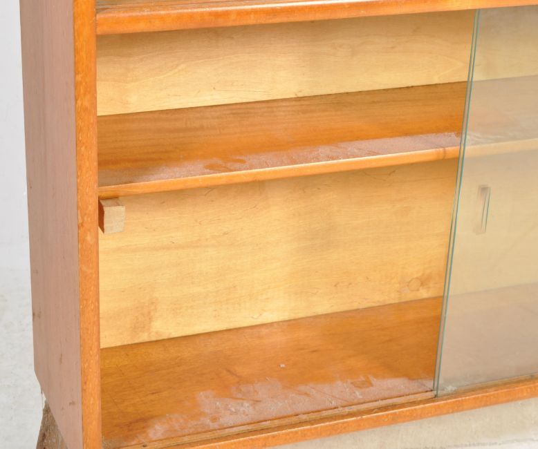 A vintage retro 20th century teak wood bookcase / display cabinet by Herbert Gibbs. The cabinet having sliding glass doors raised on a plinth base. 112cm h x 91cm w x 26cm d