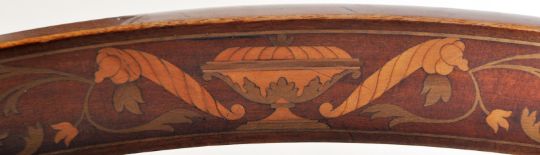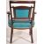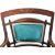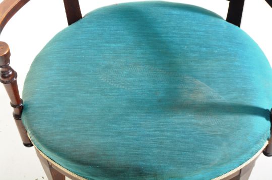 An Edwardian inlaid bedroom chair / easy lounge chair by James Shoolbred & Co having a boxwood inlay back bar with urn and floral scroll. Vibrant teal upholstered back and cushioned circular seat. Shaped scroll arms with inlaid floral motifs and turned columns. All raised on tapering square legs with inlaid detailing and spade feet. The legs stamped Jas Shoolbred & Co 5560. Some chips to the wood and wear / marks commensurate with age but overall in good condition. Measures approx; 77cm x 59cm x 49cm.