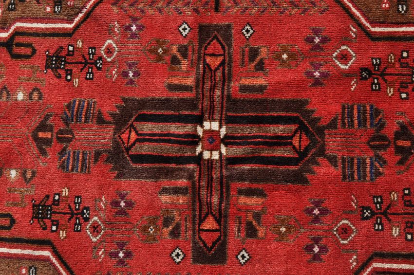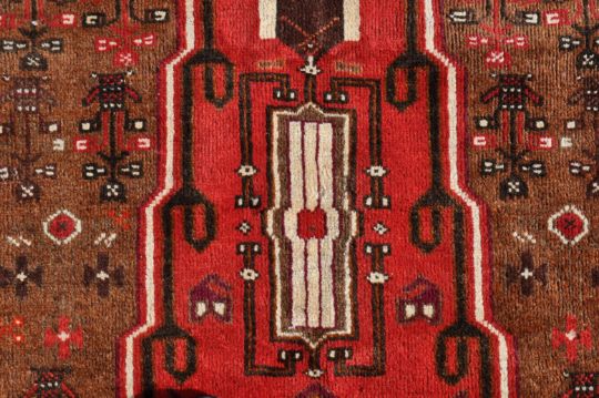 A 20th century hand woven Persian Islamic rug Meshed Belouch rug / runner. The rug having a large red geometrical shaped medallion to the centre decorated with floral motifs set on cream mustard / brown field decorated with floral motifs, black / dark blue main border with red geometrical motifs. Short fringes to each end. Measures: 300cm x 127cm.