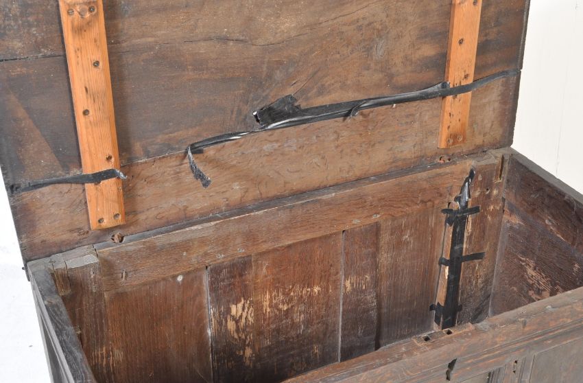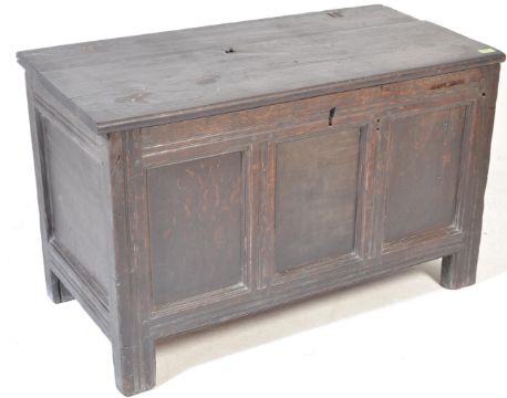 A 17th century oak coffer / blanket box. The coffer of a rectangular form with hinged lid, three oak panels to the front, peg joints raised on shaped supports.  Measures: 65cm x 104cm x 54cm.