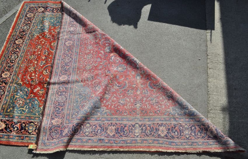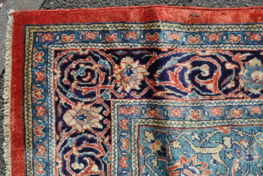 An early 20th century circa 1930’s hand woven Persian Islamic Sarouk rug / carpenter. The rug having a blue flower head medallion set on red field decorated with floral motifs and dark colour main border. Short white fringes to each end. Measures: 330cm x 250cm.
