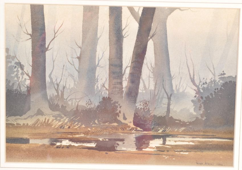 Peter Atkin - Winter Wood - A 1980’s water colour painting depicting bottom half of a tree forest in winter. Framed and gales. Signed and dated 1982 to the lower corner. Measures 38cm h x 43cm w