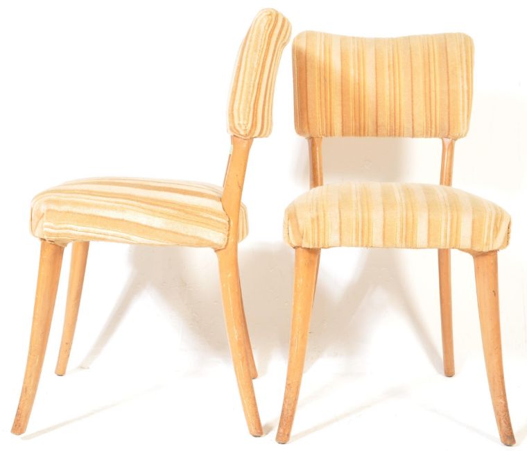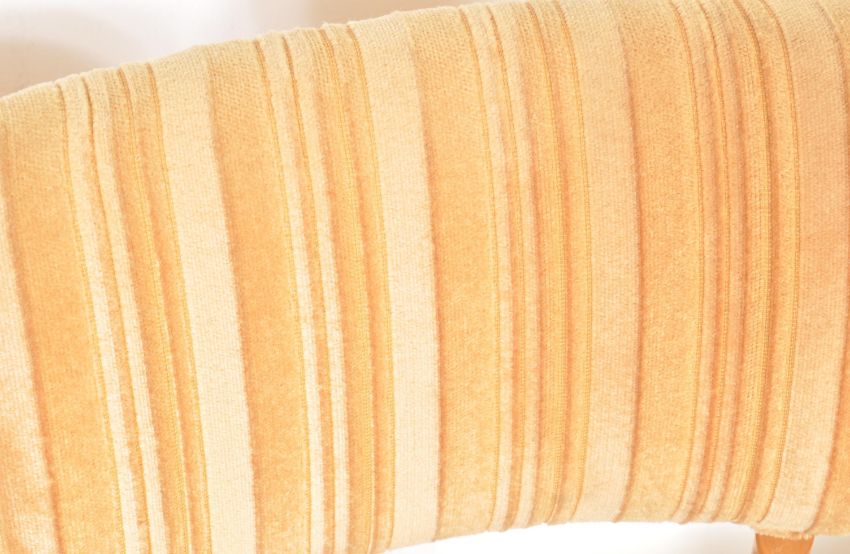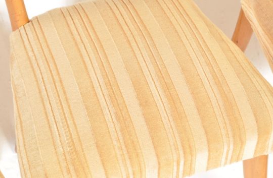 A set of four mid 20th century Danish inspired dining chair. The chairs having curved butterfly shaped back rest with staffed seats, yellow fabrics upholstery raised on four elm shaped legs. Measures 83cm h x 44cm w x 43cm d