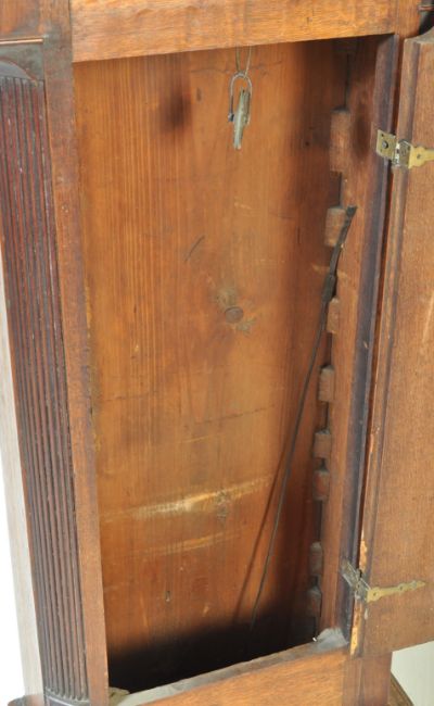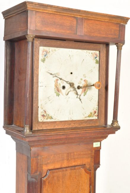 An early 19th century George III painted face oak longcase / grandfather clock. The painted dial with roman numeral chapter ring having Breguet hands, day, and date aperture centre. Painted spandrel corners, makers name illegible. Set within oak case having column hood over reeded canted edge trunk and plinth box base. Lead weight and pendulum. Measures: 90cm x 50cm x 24cm.