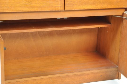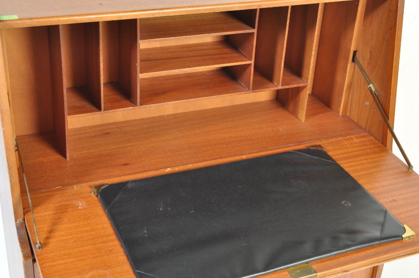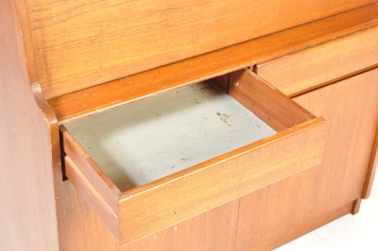 A retro vintage 1970 teak wood student bureau having a fall front writing area opening to reveal a fully appointed interior raised atop a run of two drawers. Measures 108cm x 92cm x 41cm
