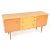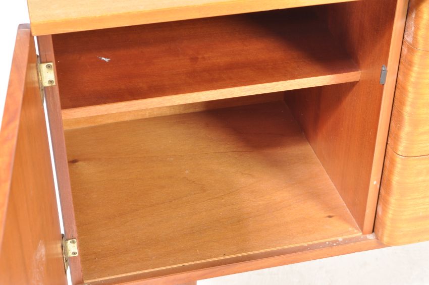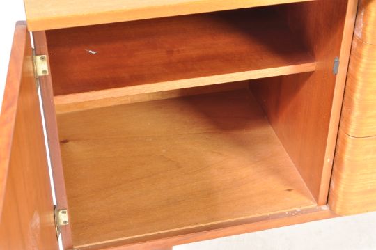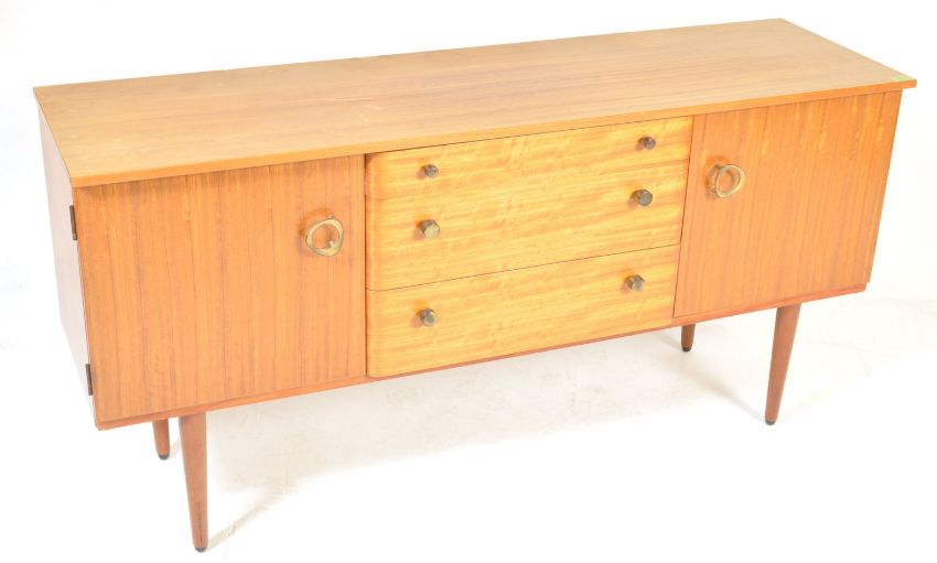 Schreiber - British Modern Design. A retro vintage mid 20th century circa 1960s sideboard credenza having a central bank of drawers flanked by single door cupboard with ring handles raised on tapering supports. Measures 70cm x 141cm x 41cm.