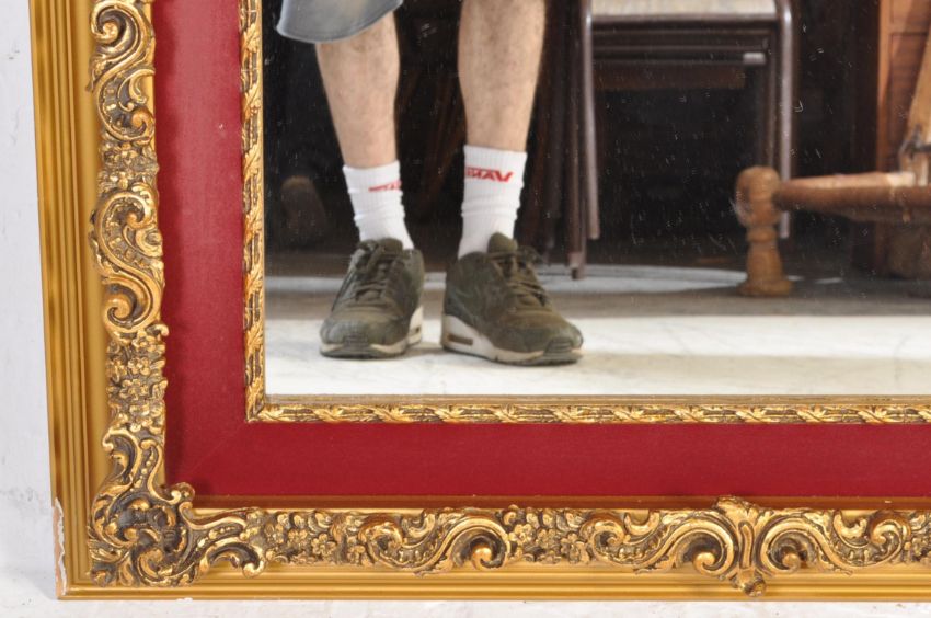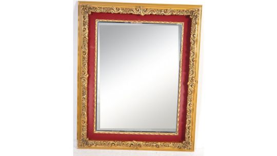A large contemporary gilt mirror of rectangular form having floral decoration to the frame with a red border inset. Mirror measures 116cm h x 91cm w