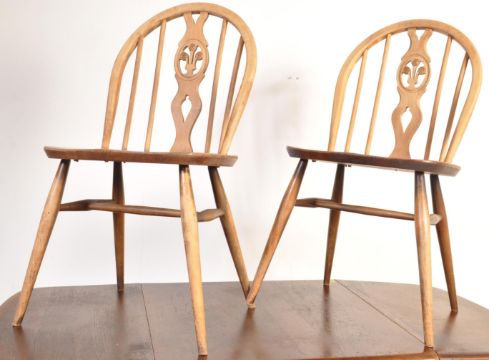 Ercol - Lucien Ercolani. A retro vintage 1970s dark elm drop leaf dining table of circular form having a chamfered edge raised on square tapering legs united by cross stretchers.  Ercol stamp to the underside. Comes with four Ercol fleur de lys dining chairs. Measures 72cm h x 137cm w x 74cm d