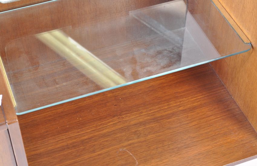 Ernest Gomme - E Gomme G Plan Furniture - Librenza - Model 1862 - An original retro vintage mid 20th Century tola wood dressing table desk having an adjustable swing cheval mirror over two drawers and two glass shelves all raised on ebonised frame and brass adjustable feet. Measures