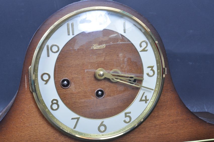 A late 20th century German made Franz Hermle Napoleons hat mantel clock having a Westminster chime having a brass and white enamel clock face with Arabic numerals to the chapter ring. Measures 22 cm wide. Comes with key.