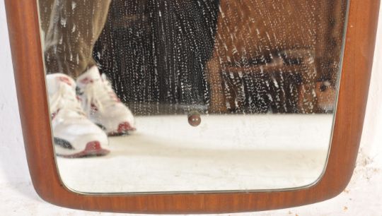 A vintage retro mid 20th century Danish inspired frameless mirror. The mirror on a long rectangular form set on a teak wood back. Measures 98cm Tall