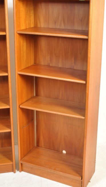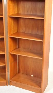 A pair of vintage retro mid 20th century teak wood open window bookcaseS. The bookcases being of a tall rectangular form with adjustable shelves raised on a plinth base. Measures 152cm h x 89cm w x 30cm d
