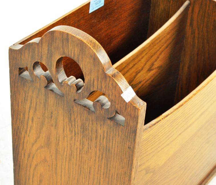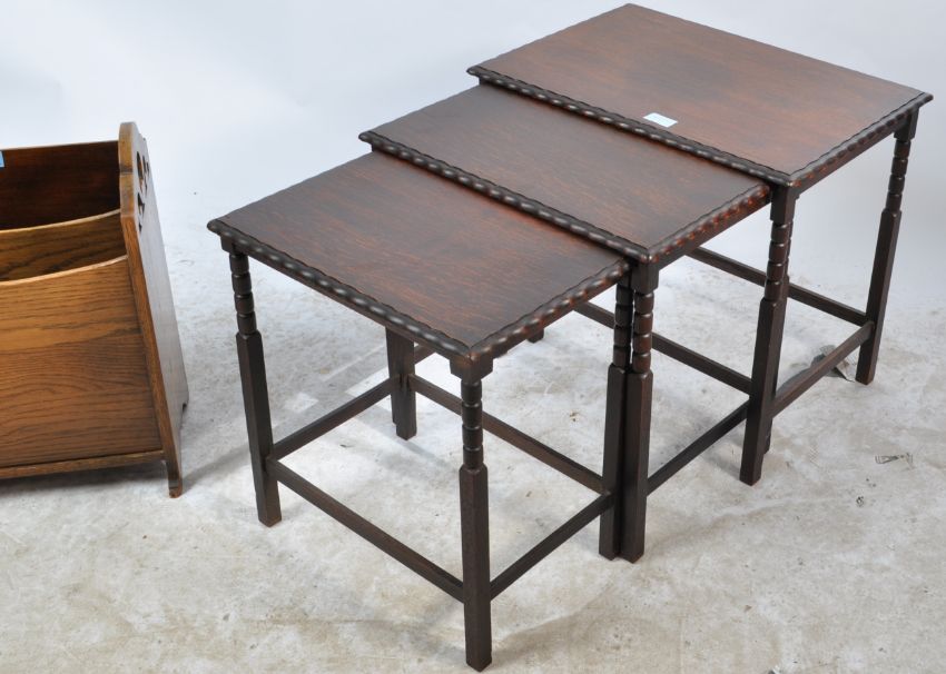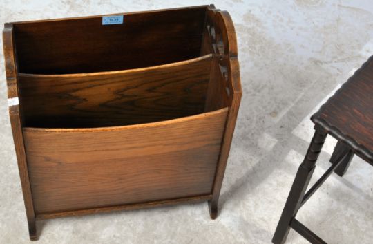 An early 20th century circa 1930s magazine rack having pierced supports raised on splayed feet and a William and Mary revival nest of tables. Nest measures 45cm x 39cm x 21cm.