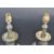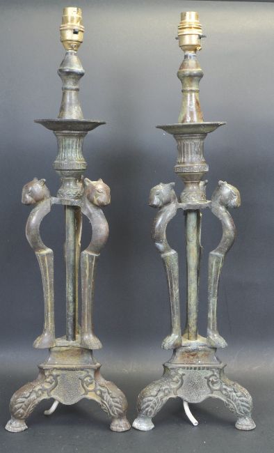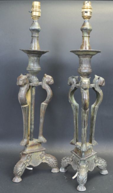 A pair of early 20th century brass / bronze Art Nouveau style lamps. The lamps having single brass fitting atop with turned column, wax tray, three leopard head central column raised on three points base with foliate decorations.