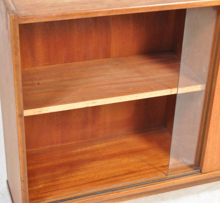 A vintage retro mid 20th century circa 1960’s Danish inspired teak wood bookcase. The bookcase of a long low rectangular form having a glass sliding door to the left and panel sliding door to the right opening to reveal adjustable shelves to the inside raised on shaped legs. Condition. Good overall, no major damage just wear and tear. Measures 65cm h x 102cm w x 26cm d