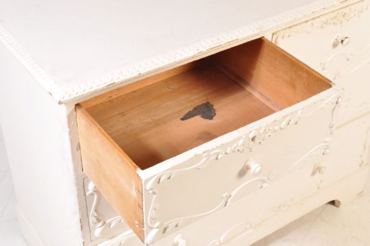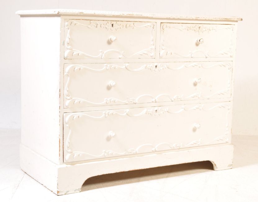 A Victorian 19th century painted pine chest of drawers. Raised on ogee bracket feet with shaped apron. Above, a 2 short over 2 deep drawer configuration  having embellished scroll worked detailing. Finished with knob handles