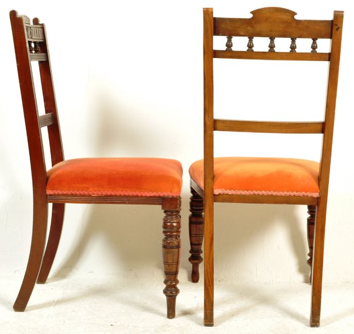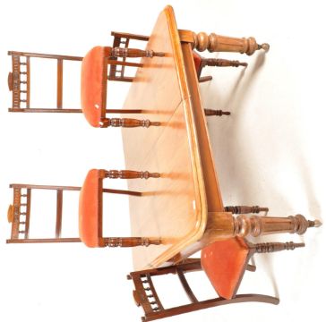 A 19th century Victorian mahogany extendable dining table having a chamfered edge raised on reeded baluster legs together with a set of four dining chairs having carved top crest, red upholstered seats raised on turned legs. Measures, 76cm x 141cm x 136cm (not extended) Leaf 49cm.