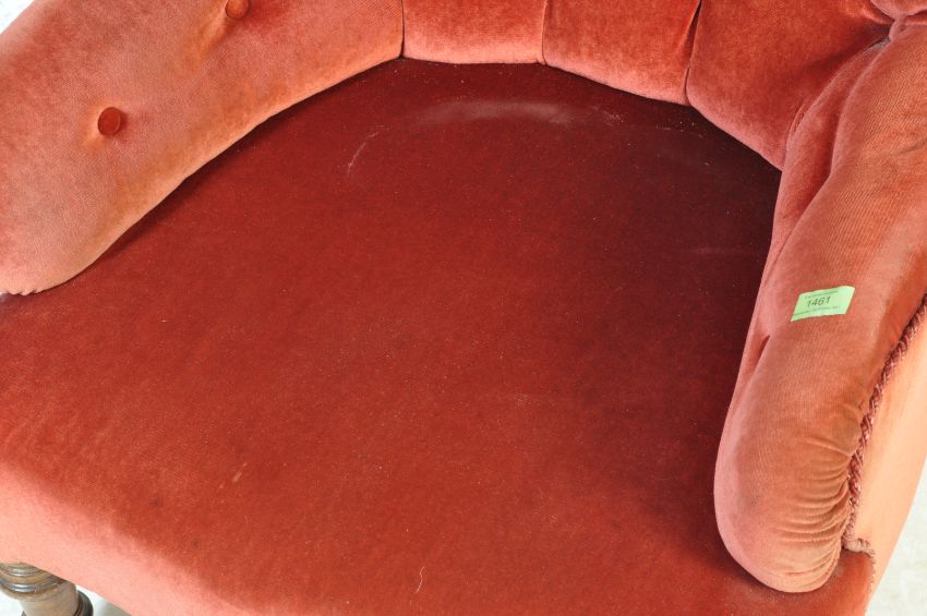 A 19th century Victorian mahogany armchair being raised on mahogany turned legs with castors being upholstered in a dusky pink damask fabric. Measures: 89cm x 64cm x 52cm.