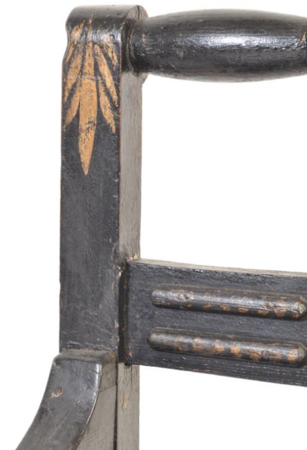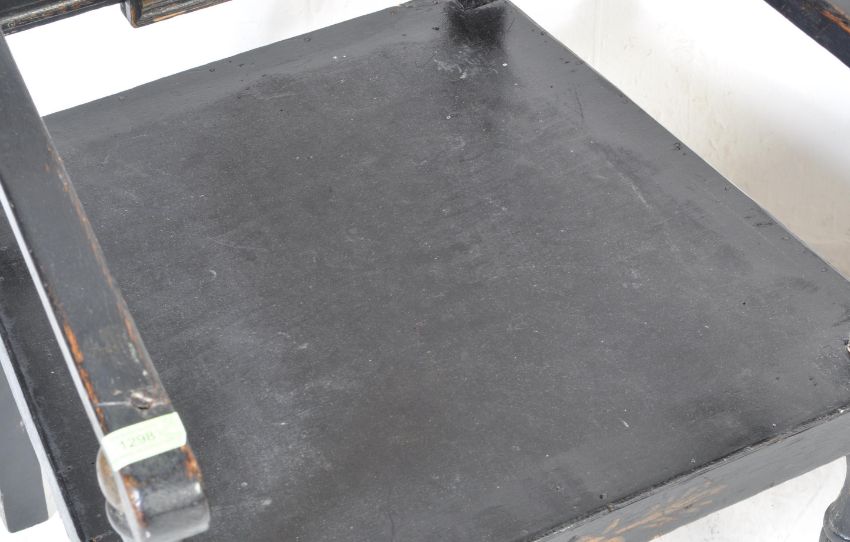 A pair of early 20th century Regency Revival ebonised armchairs having gilt decoration  with a twin panelled back rest, scrolled elbow rests raised on a panel seat atop turned tapering legs. Measures: 88cm x 57cm x 52cm.