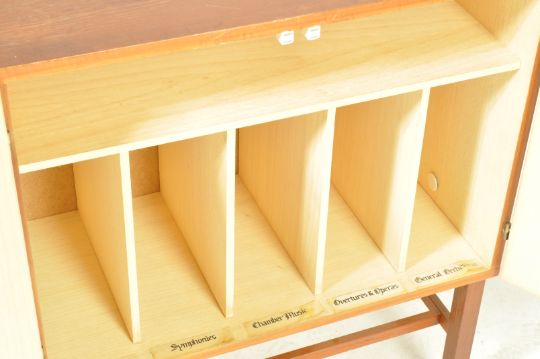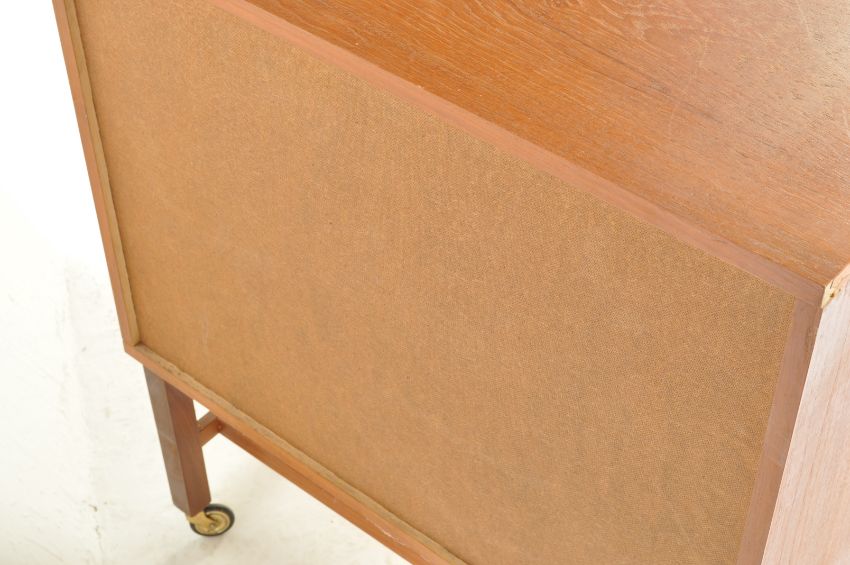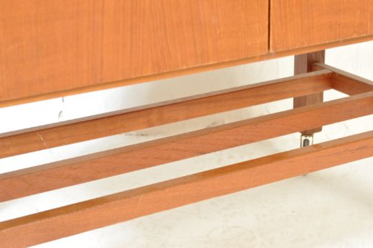 A vintage retro mid 20th century Danish inspired teak wood Hi-Fi cabinet. The cabinet of a rectangular form having twin doors opening to reveal a fitted interior raised on square legs united by a magazine rack with casters. Measures: 79cm x 69cm x 38cm.