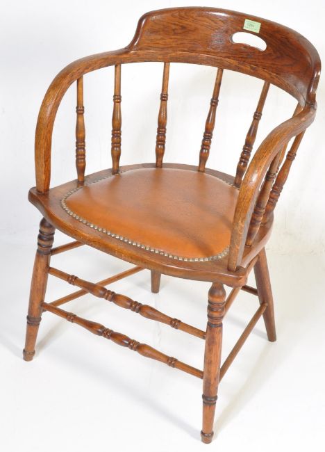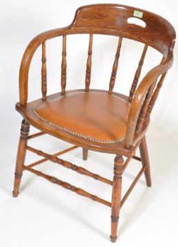A mid 20th century beech and elm office Windsor type desk chair having a pierced spindle back rest over a cushioned seat, scrolled elbow rests, raised on turned legs united by stretchers. Measures 77cm h x 52cm w x 55cm d