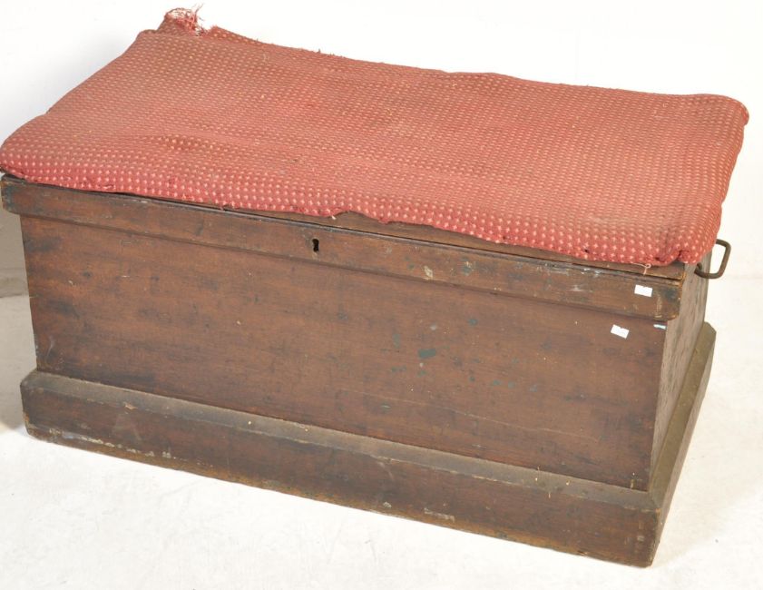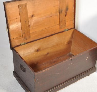 Two 19th century Victorian painted pine blanket boxes. The boxes having flared lids opening to reveal a spacious interior raised on a plinth base. Both with carry handles to each side. Measures 48cm h x 102cm w x 54cm d