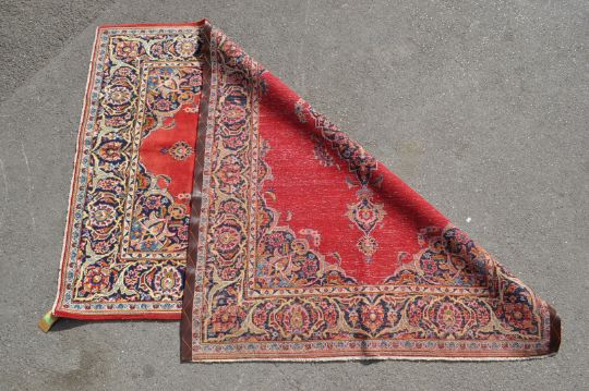 A mid 20th century circa 1940’s hand woven Persian Islamic Kashan carpet rug. The rug having a large floral decorated medallion to the centre set on a red field with floral decorated corned and main border. Measures: 220cm x 130cm