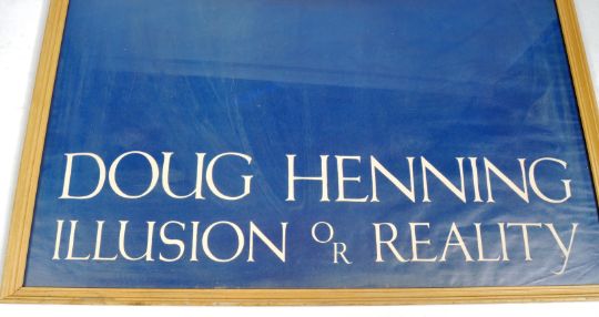 A large retro vintage 20th Century advertising display poster for Doug Henning ' Illusion Or Reality '. The poster having a blue backdrop with fading mountains and clouds with a central imagery of Henning. All being framed and glazed. Condition; appears in good condition within the frame. Measures approx; 118cm x 80cm.