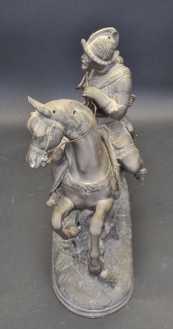 An early 20th century spelter statue of a soldier on a rearing horse raised on a naturalistic base. A/F