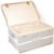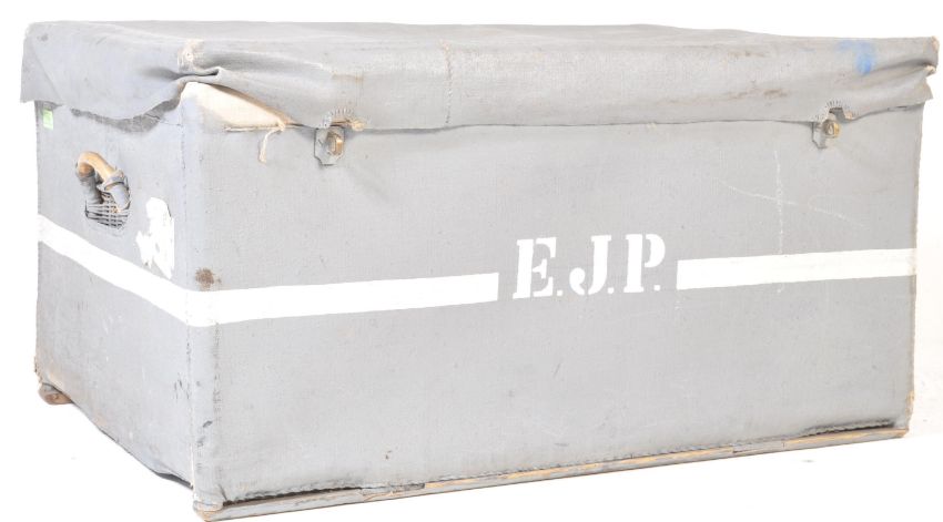 A vintage 20th century wicker basket / chest of rectangular form with hinged top.  The top having a painted canvas protective exterior with the monogram initials EJP painted to the lid.
