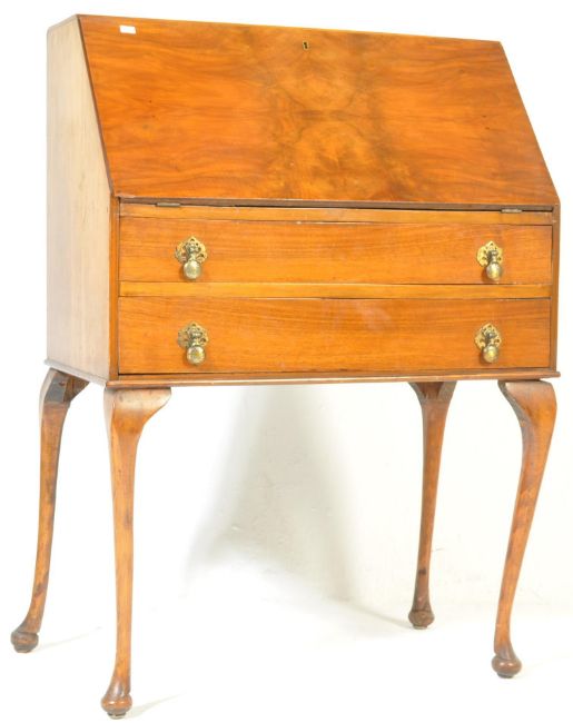A 1940's Queen Anne revival walnut writing bureau being raised on tall cabriole legs with pad feet. The bureau with appointed interior set over a twin drawer to the frieze having brass drop handles. Measures 98cm h x 69cm w x 42cm d