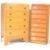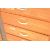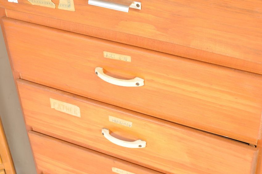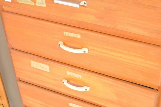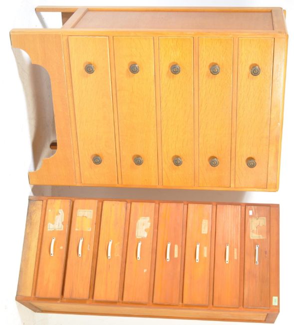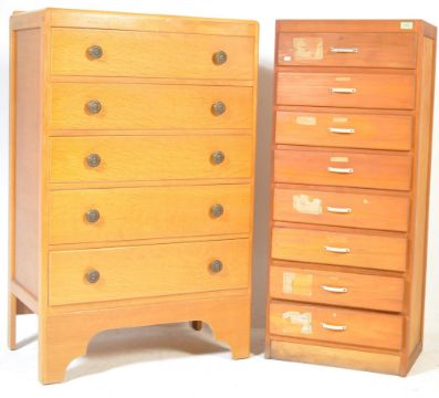 Two mid 20th century pedestal upright panel wood chest of drawers. A tall oak veneer chest of drawers having five graduate drawers raised on shaped legs along with a pedestal eight drawer panel wood chest of drawers with plastic handles raised on a plinth base. Measures: 121cm x 77cm x 46cm.