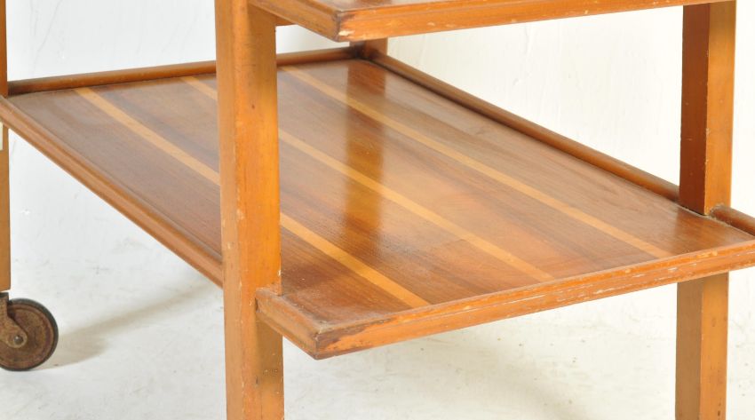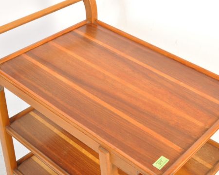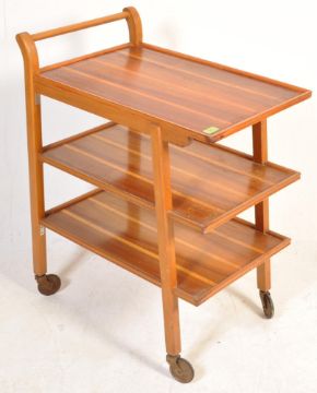 A vintage retro mid 20th century circa 1960’s Danish inspired cocktails / drinks trolley / serving trolley. The tree tear trolley of a tall form with shaped edges, turned single handle to the side raised on turned supports with castors. Measures 85cm h x 67cm w x 44cm d