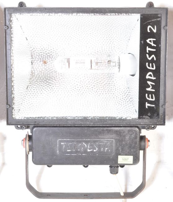 Set of four retro vintage floodlights in black with hanging wall supports reads 'Tempesta 2'. Measures 55cm x 41cm x 44cm.