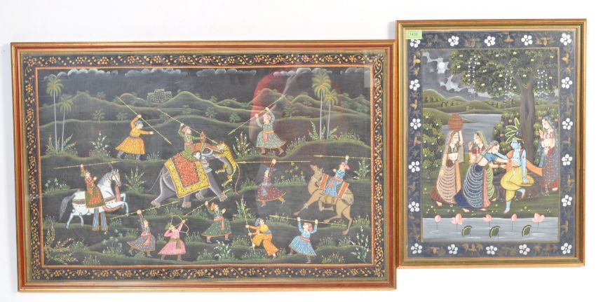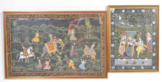 Two vintage 20th century Indian Mughal style reverse painted glass pictures portraying men hunting a tiger together with another. Framed. Largest measures 57cm x 87cm.