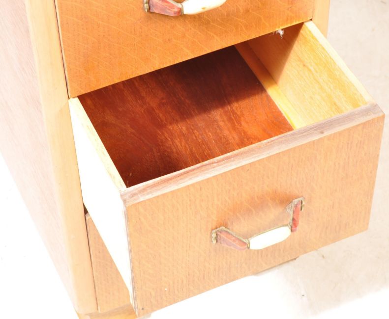 An early 20th century circa 1930’s Art Deco dressing table. The dressing table having a bevelled glass mirror over a drop in centre with single drawer to the frieze above a kneehole flanked by a bank of three drawers to each side together with a blessing table stool. CC mark to the back. Measures: 154cm x 102cm x 26cm.