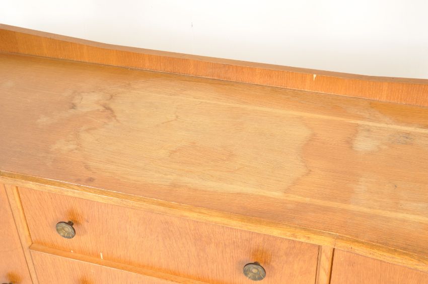 A vintage retro mid 20th century dinning suite. The collection comprising of a dining table by David Joel Ltd Kingston Bypass London. The table having a rectangular maple veneer top with arched ends raised on shaped supports together with three dining chairs having reed upholstery and an oak veneer sideboard credenza having small gallery back with a bank drawers to the centre flanked by two single door cupboards with brass pull handles raised on shaped supports. Makers label to the underside of the dining table. Measures: 93cm x 138cm x 46cm.