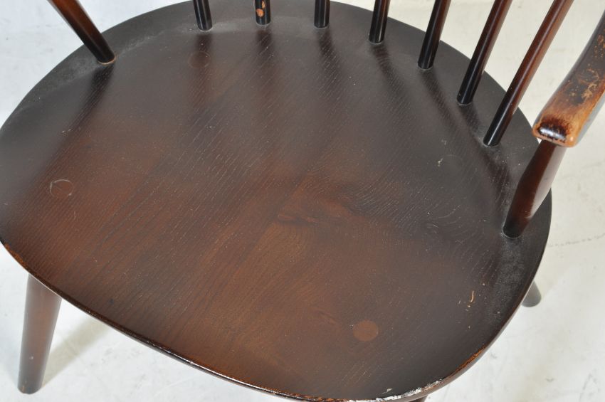 A vintage retro mid 20th century Lucian Ercolani / Ercol beech and elm stained children chair. The chair having curved top rail in a form of cow horn with spindle backrest, saddle seat raised on turned supports united by stretchers. Measures 67cm x 54cm x 41cm.