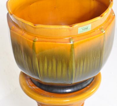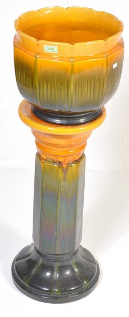 A large early 20th century circa 1920s Art Nouveau majolica planter and stand in drip glaze decoration of green and yellow hues. Measures 96cm h x 32cm diameter